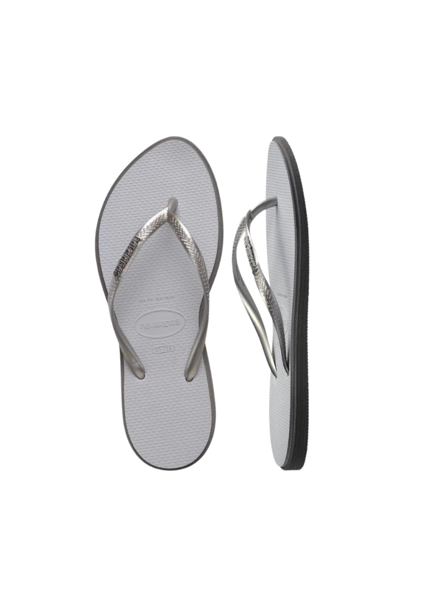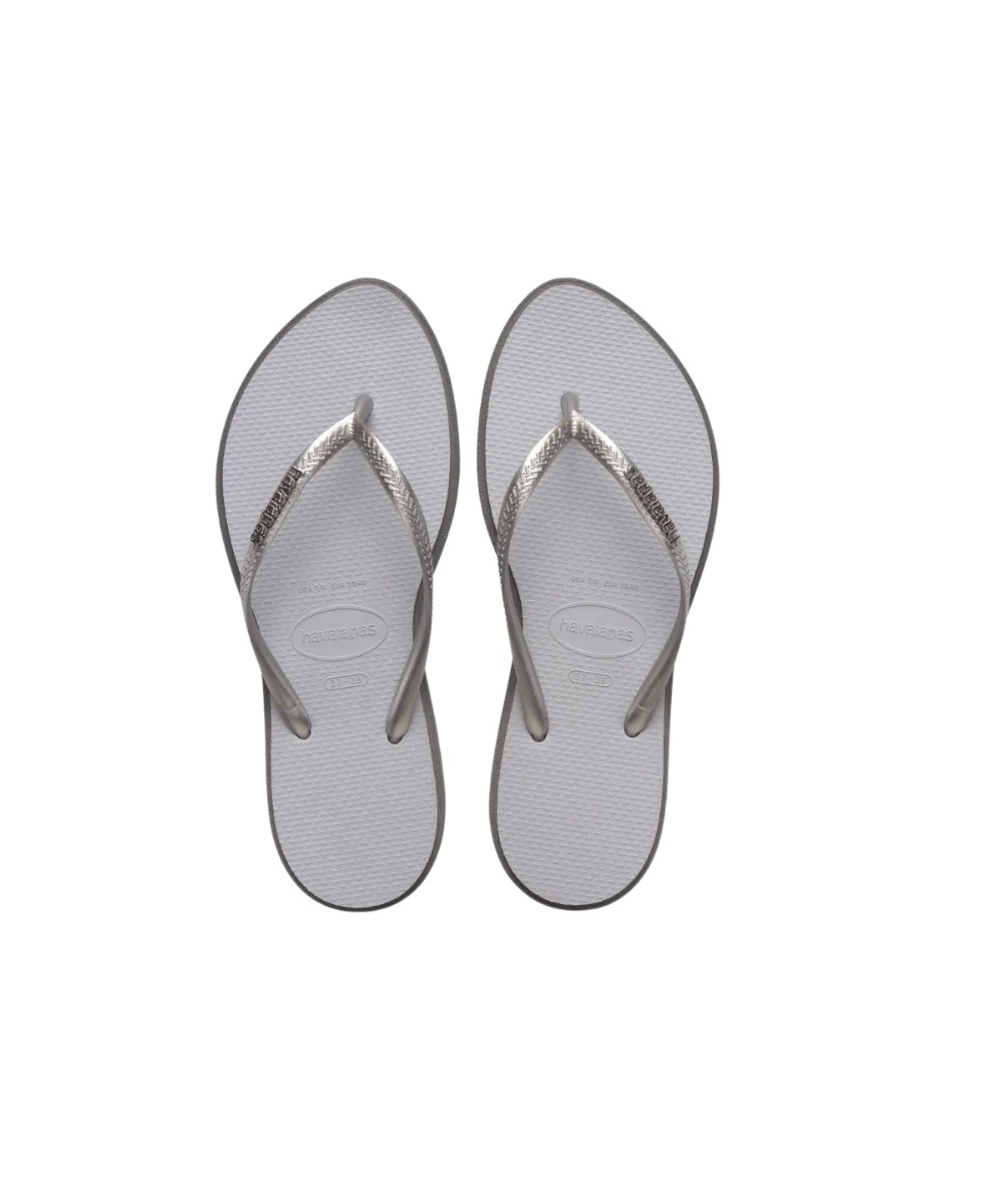 A nova Havaianas Slim Point tem tudo para ser sucesso! O destaque desse chinelo é o bico levemente pontudo, que é a nova tendência, dá todo um diferencial para os pés. Além disso, tem bordas e laterais em cores que contrastam com os tons pastel da sola e das tiras finas com logo metálico, criando um efeito moderno-colorido.