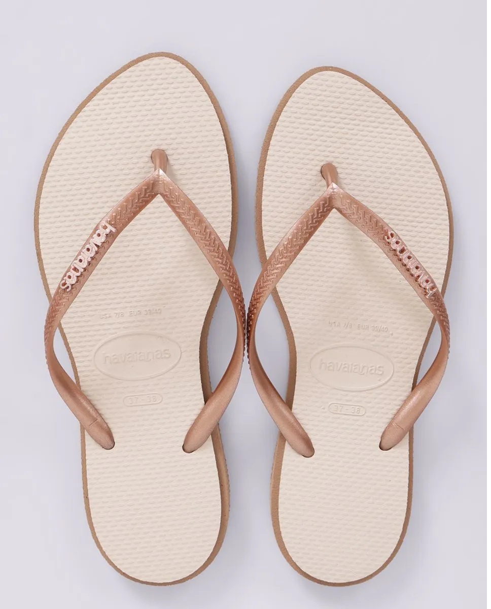 A nova Havaianas Slim Point tem tudo para ser sucesso! O destaque desse chinelo é o bico levemente pontudo, que é a nova tendência, dá todo um diferencial para os pés. Além disso, tem bordas e laterais em cores que contrastam com os tons pastel da sola e das tiras finas com logo metálico, criando um efeito moderno-colorido.